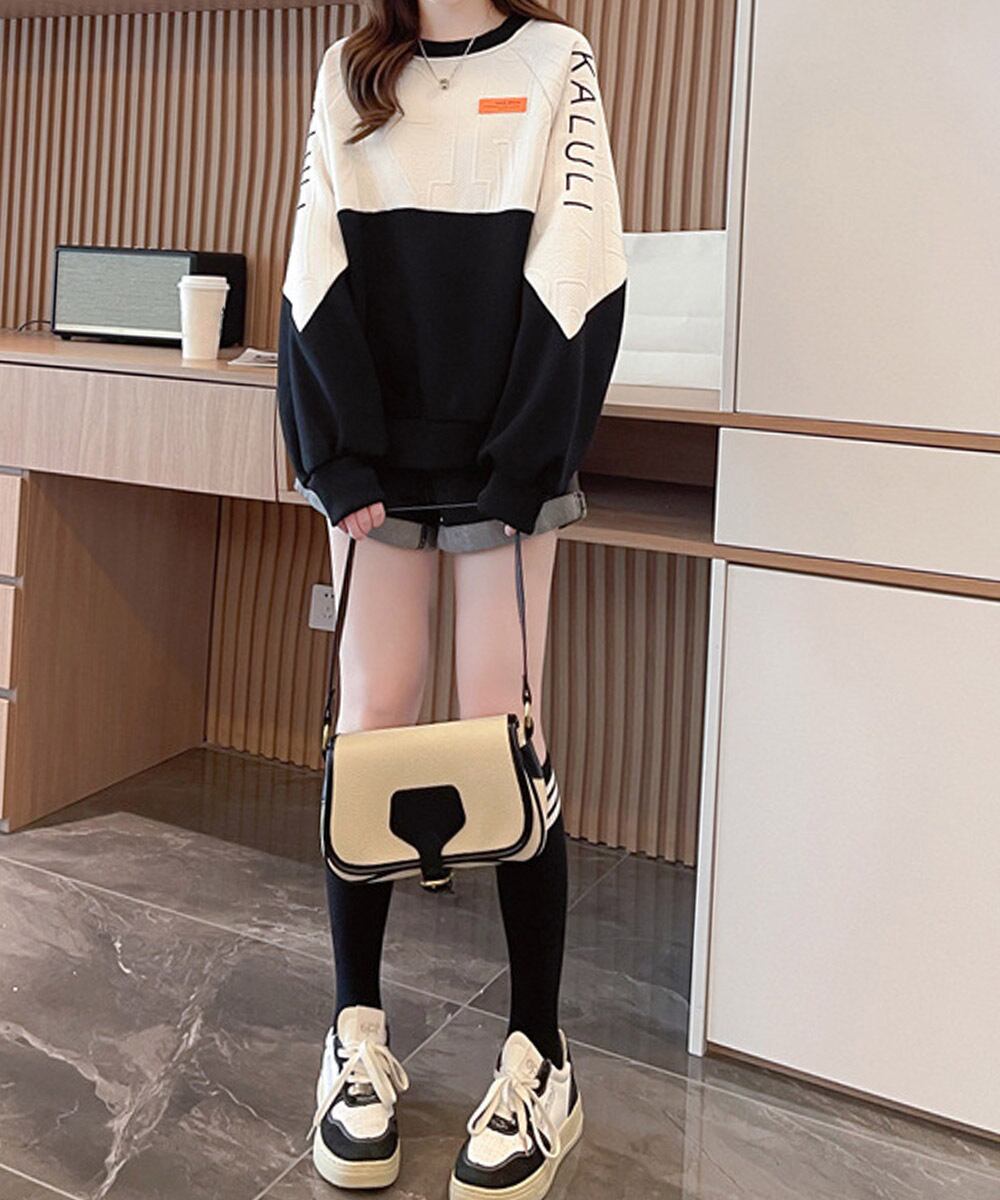 配色トップスお洒落 プルオーバー着やせ ロゴトレーナー春服