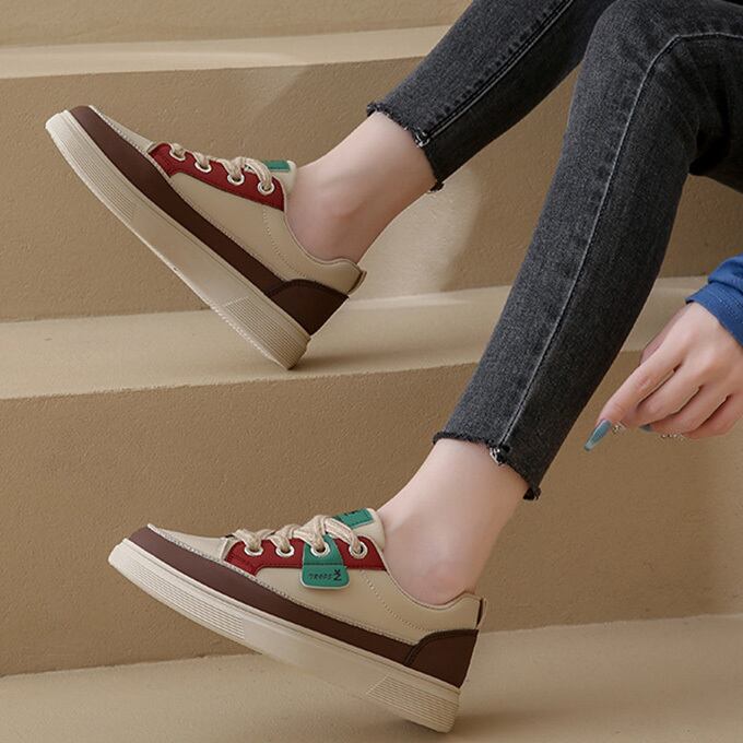 レディース レトロ感 バイカラー 配色 スリム スニーカー 紐靴 シューズ レザー調