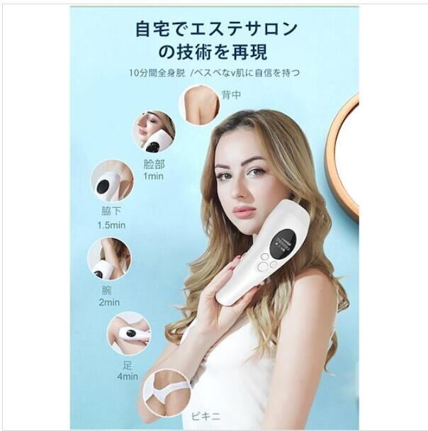 【脱毛使用範囲】顔にも使用でき、手足、脇、Vライン、口角周りと、ほぼ全身に使用可能です。※脚、腕、ワキ、ビキニライン、顔(頬骨より下の部分)に使用可能。この光脱毛器は体毛の色が白、グレー、金髪、赤毛の方には効果がありません。目の周りや、額には使用しないでください。医療機関でテスト済み※医療機器ではありません。