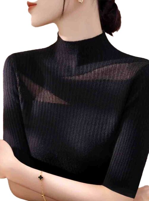 2025新作 レディース デコルテシアー リブニット ハイネック 半袖 キレイめ 夏 薄手 トップス