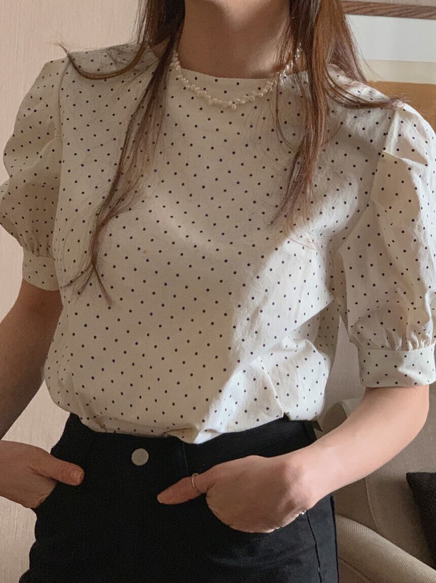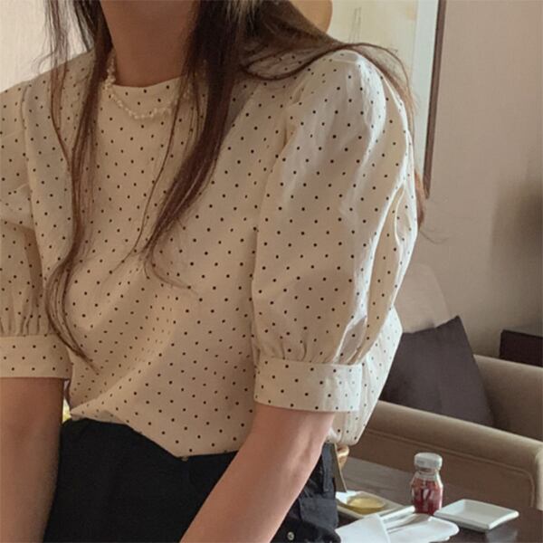 2025新作 トップス ドット柄 ボタンブラウス 上品 シャツ きれいめ パフスリーブ